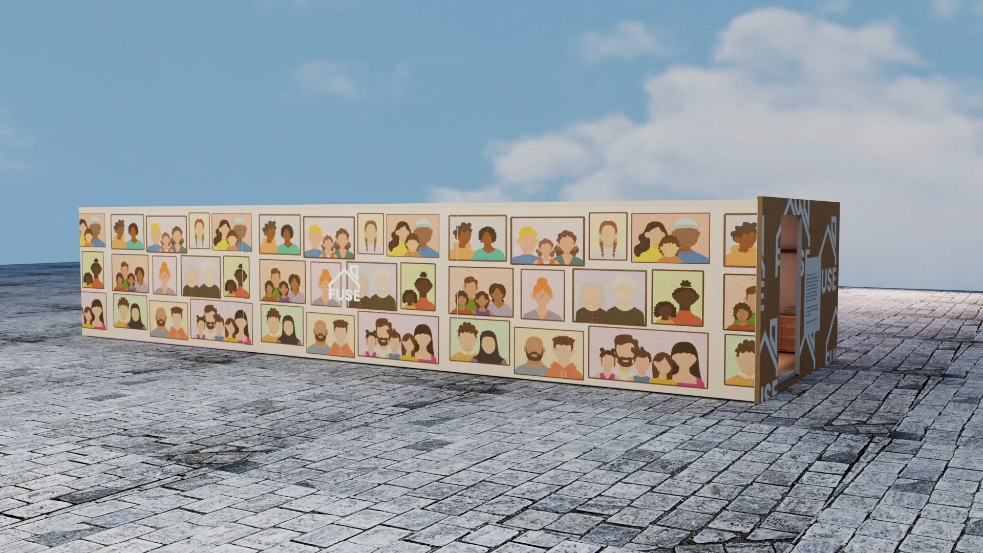 The exterior of the installation is covered in colourful photo frames depicting a wide range of families. This was designed to challenge stereotypes around fostering and communicate that anyone can foster, regardless of background or circumstance.
