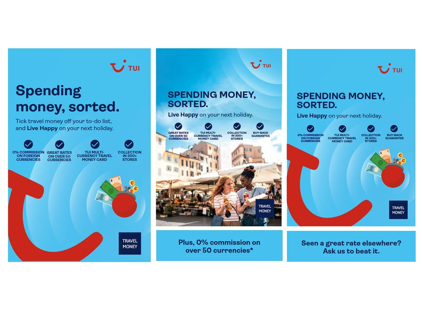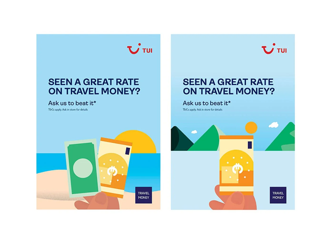 I led the design of a refreshed visual style for TUI’s FX Travel Money offering across print and digital platforms. Working within existing brand guidelines and using established assets, I developed and presented a new visual direction tailored for web, in-store, and retail touchpoints.