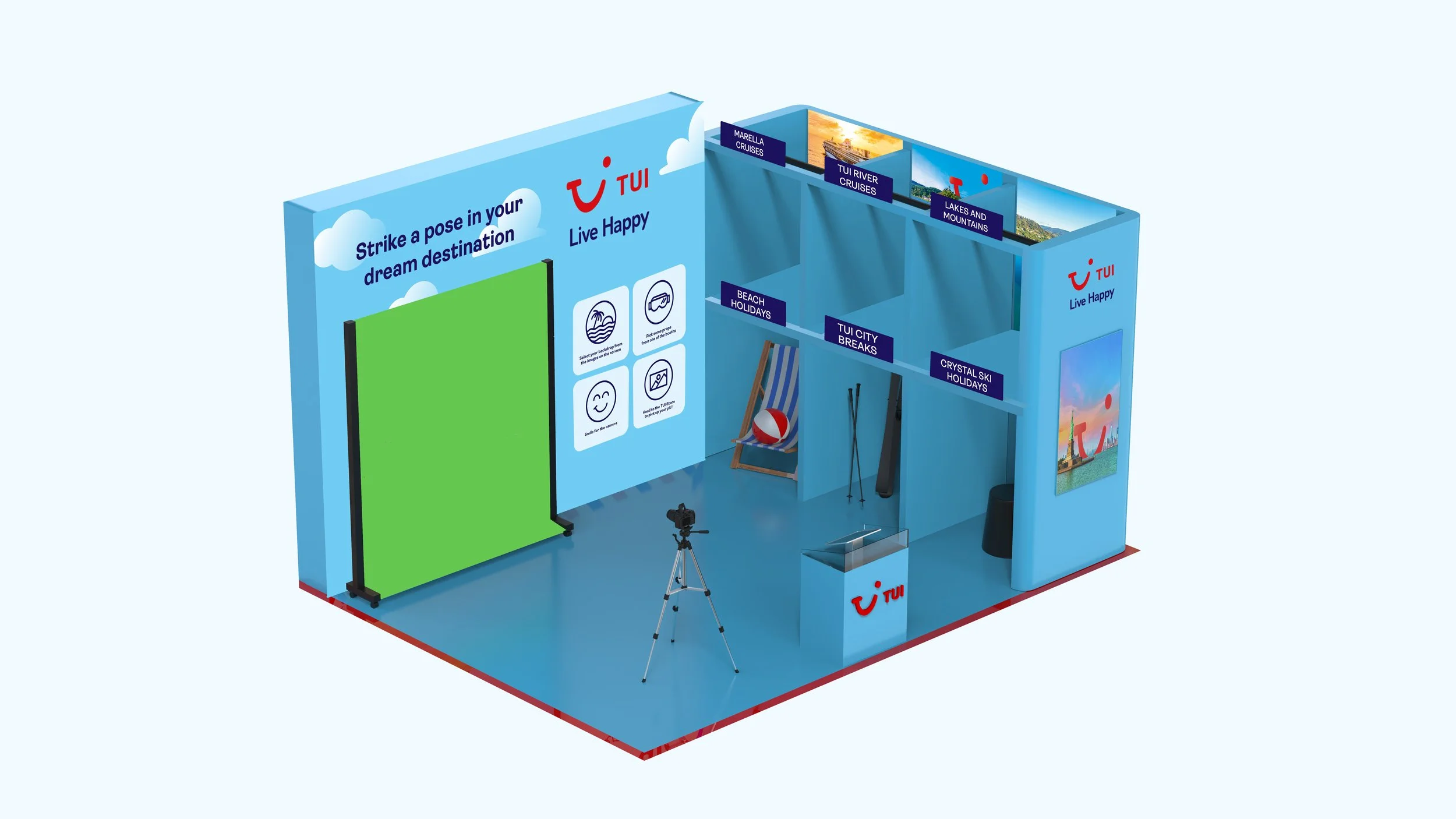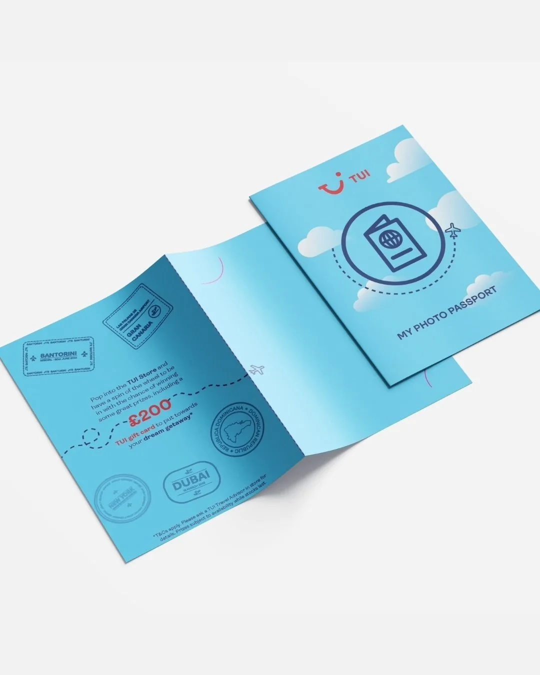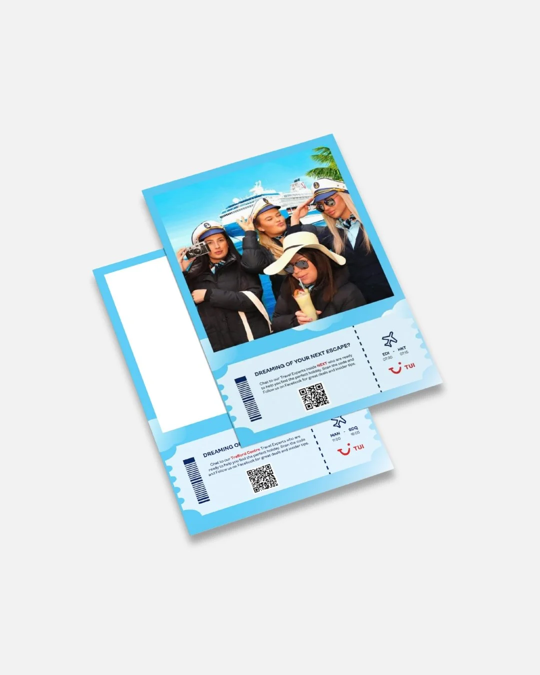 Working alongside my project manager and an external agency, I reworked their initial 3D concepts to align with TUI’s brand, delivering final artworks for the pop-up walls and creating supporting assets including Polaroid overlays, photo wallets, QR signage, and screen covers.